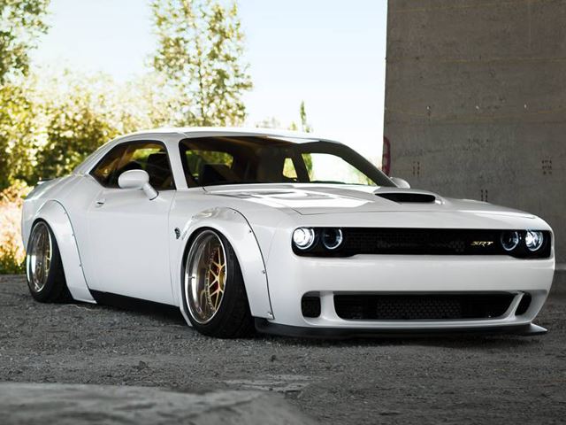 Liberty Walk kit for Dodge Challenger SRT Hellcat front three quarters view