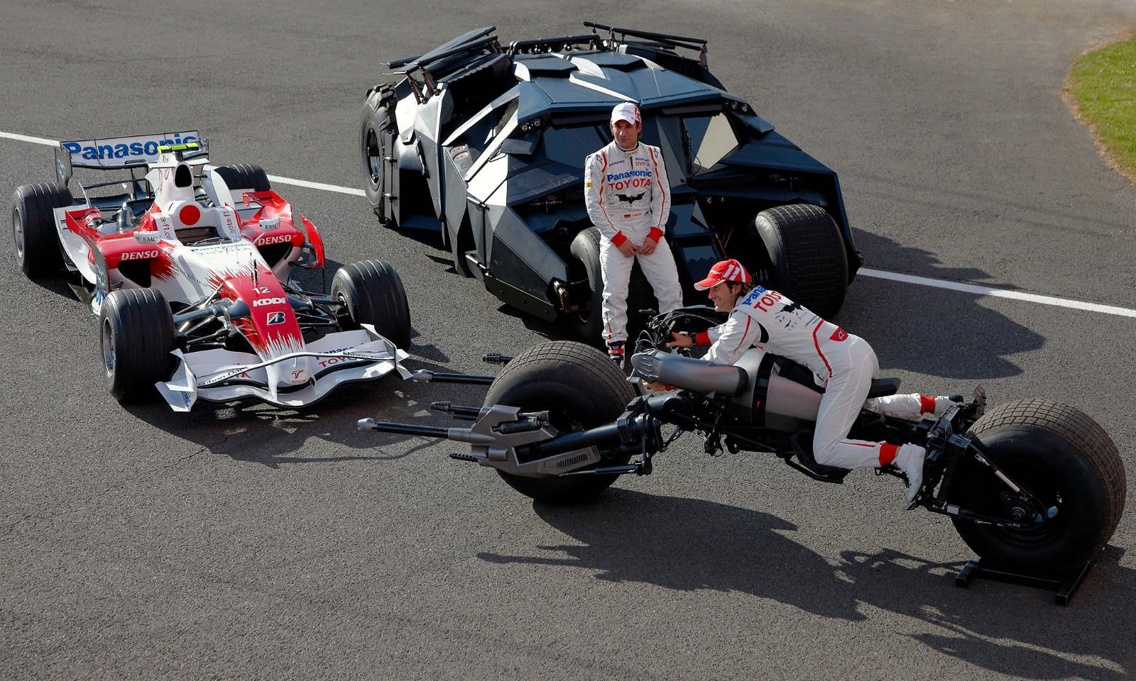 dark-knight-at-silverstone-01 back to article Once in a Lifetime Race Between Toyota F1 Car and the Batmobile! In a recent post we wrote about the gorgeous 1992 Batmobile from the movie “Batman Returns”. Now it’s time to write something fun and interesting about the monstrous Tumbler. In 2008 at the Grand Prix Formula 1at Silverstone in England the ... Read More